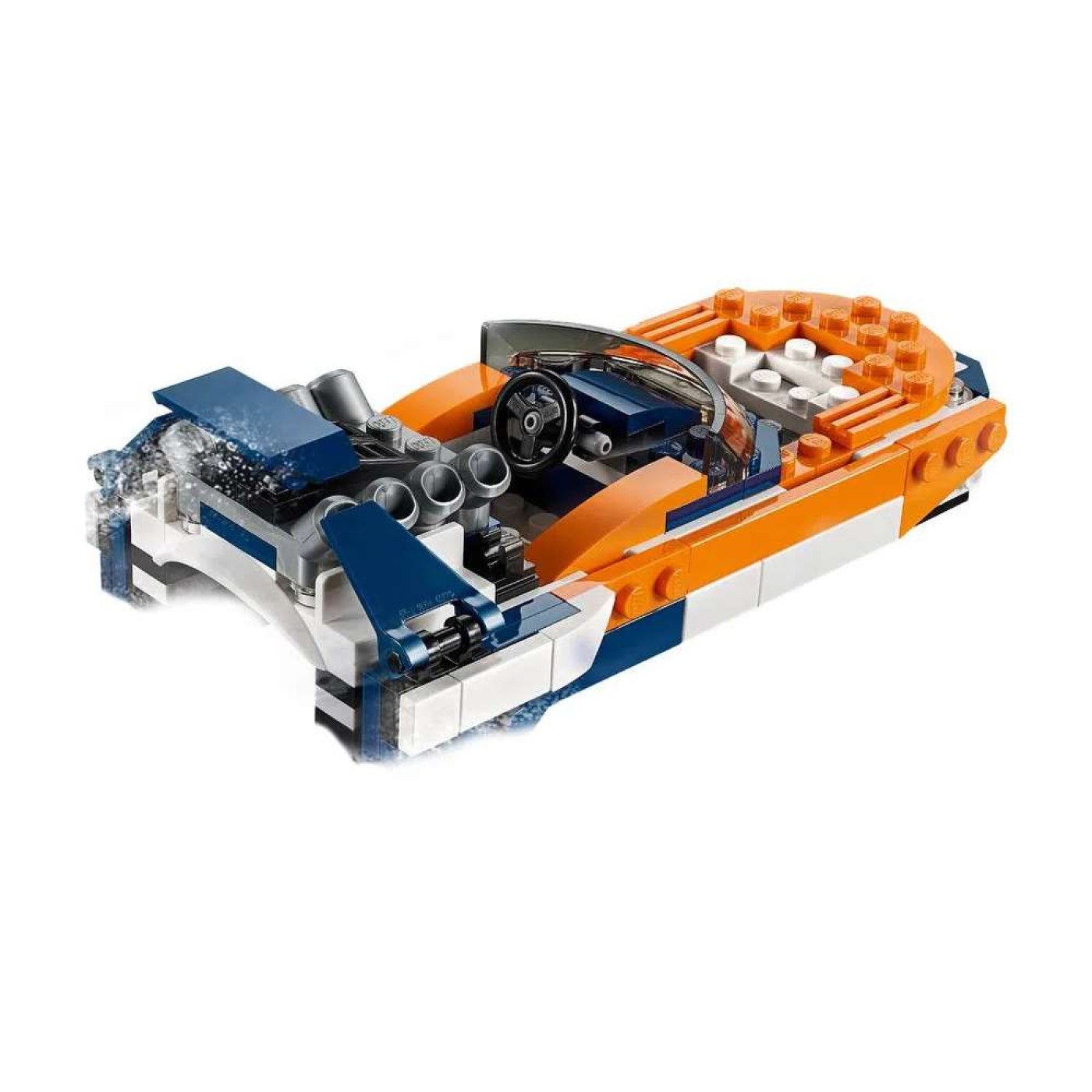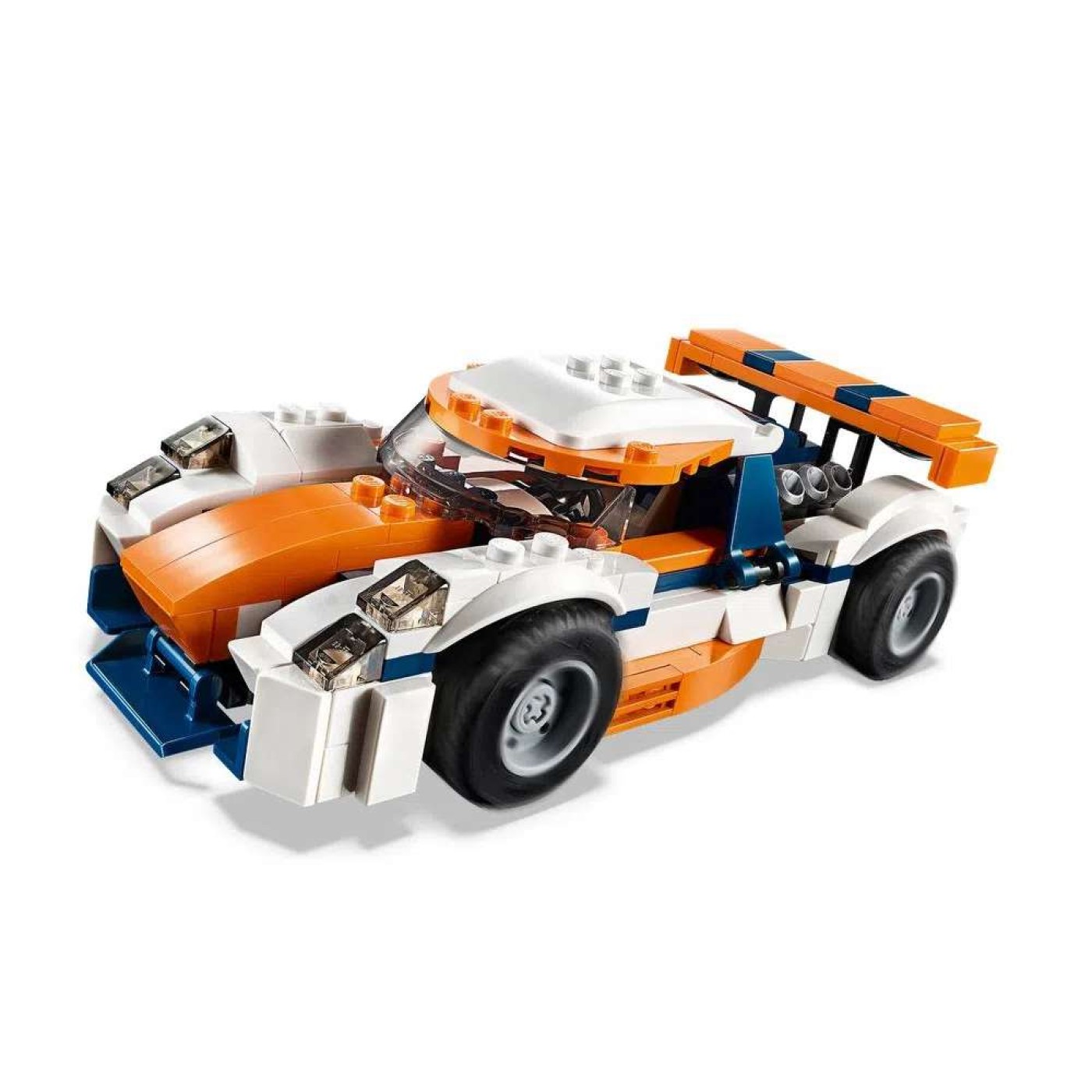 » Dê voltas ao circuito de corrida com o Carro de Corrida Sunset; apresenta um esquema de cores branco e azul escuro, carroçaria aerodinâmica com enormes entradas de ar, para-brisa redondo e colorido, faróis coloridos, motor visível instalado na traseira, grande aerofólio traseiro e pneumáticos de grande aderência ao solo. Venha descobrir o seu design de eixo cruzado e baixa fricção e levante o teto para aceder ao cockpit. Depois ocupe a sua posição na linha de partida e prepare-se para a corrida! Quando tiver terminado, reconstrua este modelo 3-em-1 LEGO® Creator para criar um Carro de Corrida Clássico conversível ou vá para as ondas a bordo do potente Barco de Corrida.