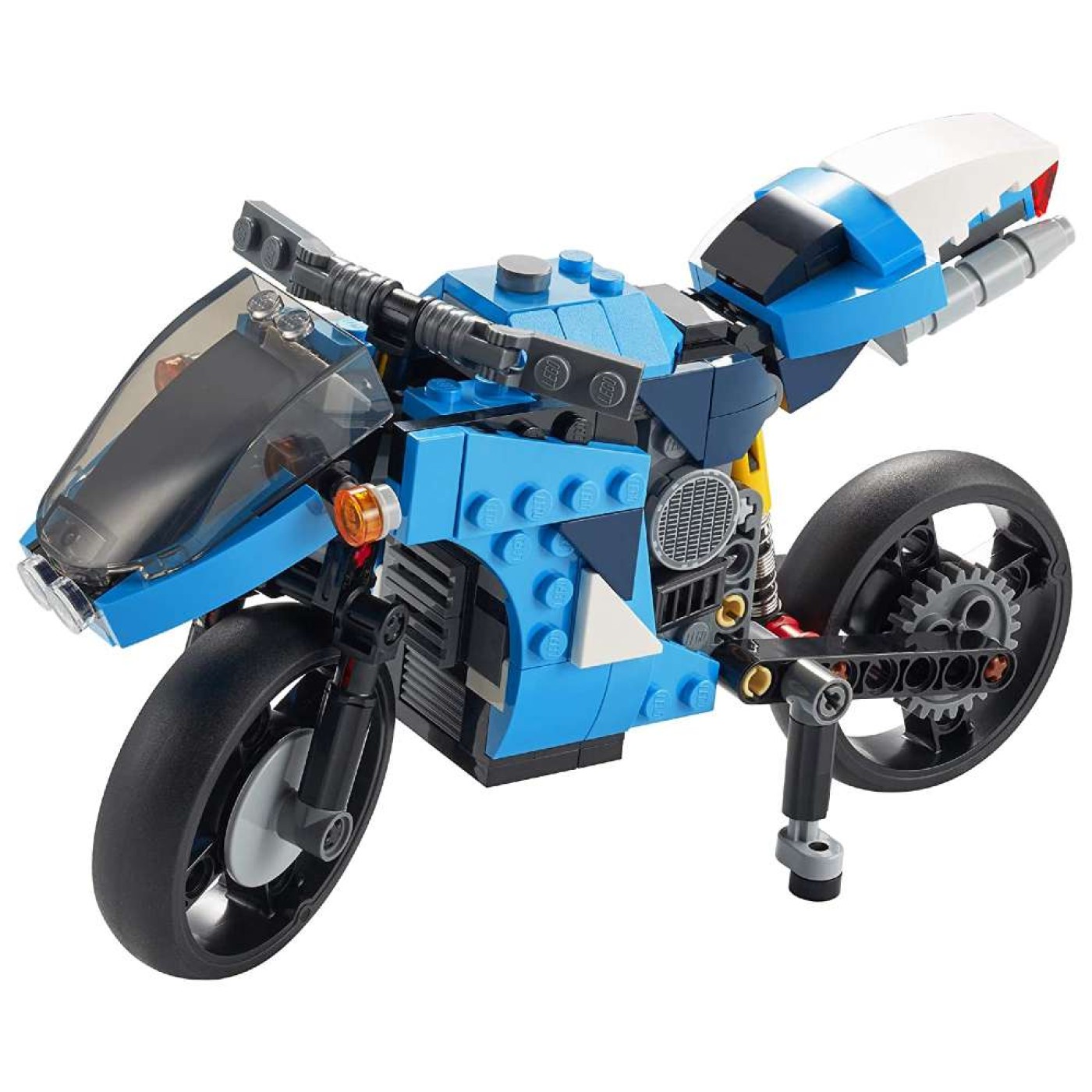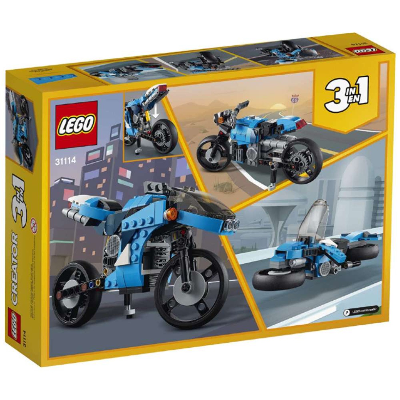 » Prepare-se para correr com a espantosa supermoto! Salte para o guidom, teste a suspensão operacional, ligue o motor e depois acelere pela pista! Quando parar, reconstrua e converta a supermoto em uma moto clássica para mais diversão de corrida, transforme-a em uma mota voadora e parta para os céus, ou dê asas a sua imaginação para construir algo de novo. Divirta-se com corrida emocionante sem parar com este incrível conjunto 3em1.