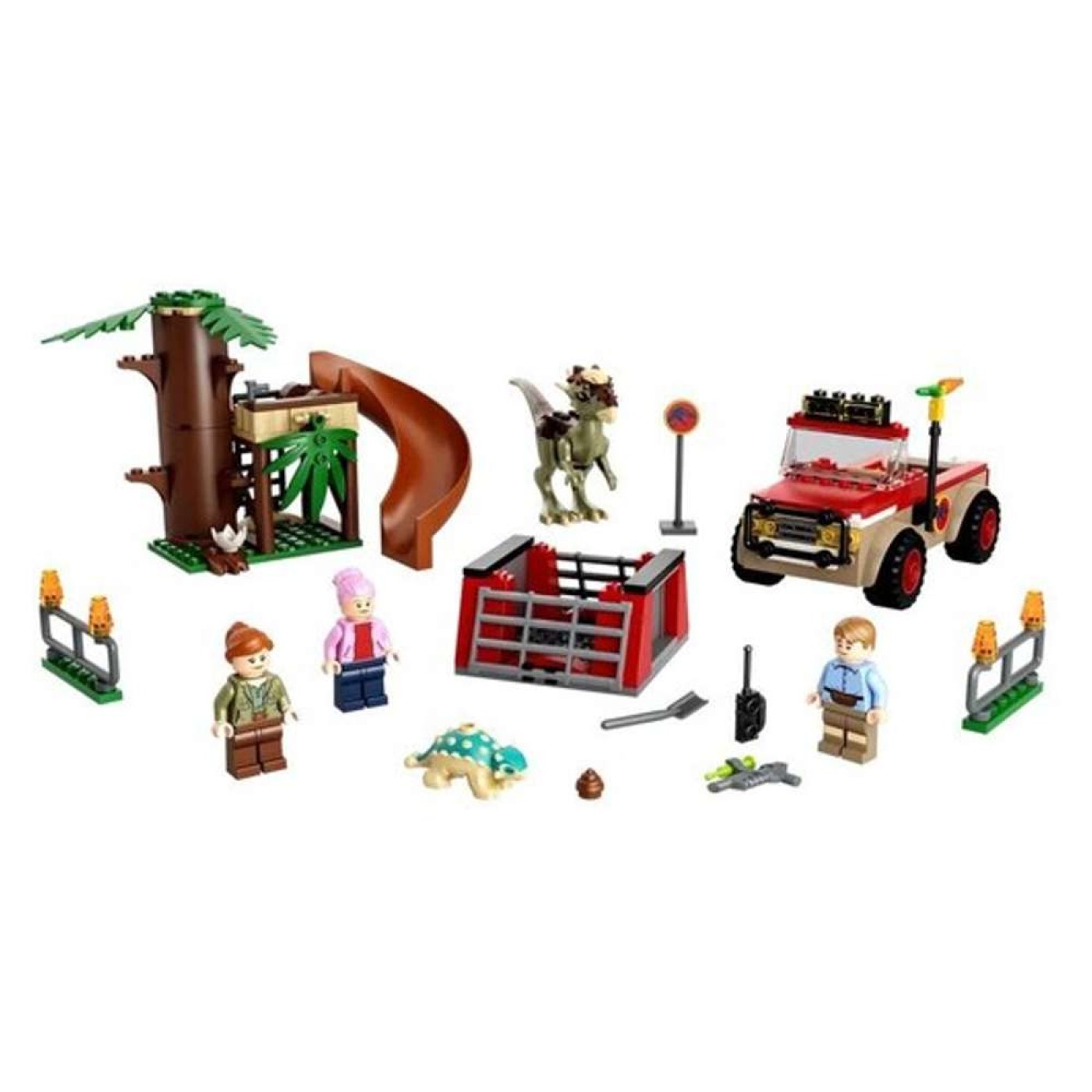 » A casa na árvore / posto de observação edificável tem uma cama, pia, vaso sanitário, escada e um escorregador para o bebê dinossauro Bumpy, e o off-roader fácil de construir tem uma gaiola removível para o Stygimoloch