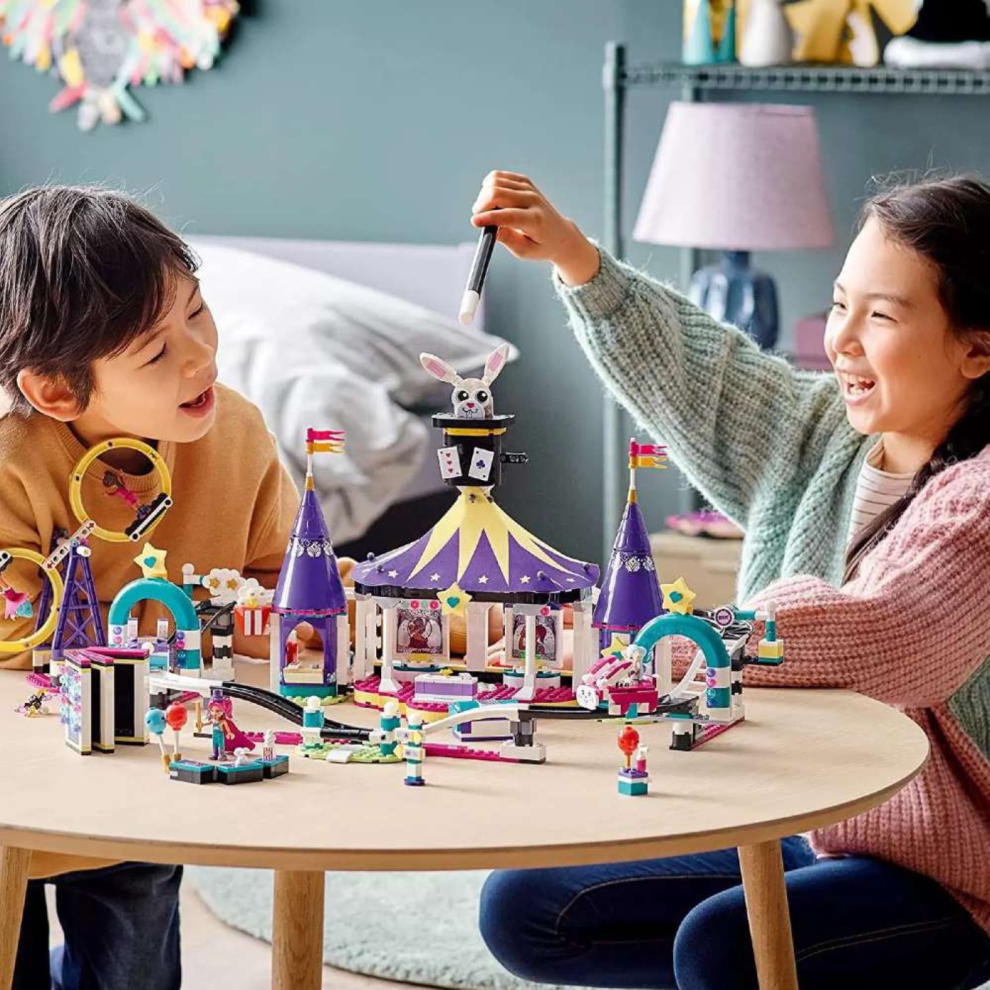Este modelo de 974 peças é um projeto de construção inspirador e, quando está construído oferece muitas maneiras criativas para brincar. No centro das atenções está a grande tenda com teto de tecido, o local para um show de mágica. As crianças podem fingir brincar de mágico e, com a ajuda de uma caixa com uma função inteligente, fazer desaparecer as minibonecas LEGO Friends! Ou podem imaginar que são malabaristas cuspidores de fogo. O conjunto traz um brinquedo de montanha-russa, completo com carrinhos de coelhinhos fofos, uma câmera e uma atração de pêndulo para colocar as crianças girando. Com as luzes apagadas, as crianças podem ver as peças que brilham no escuro ganhar vida! Magia da amizade