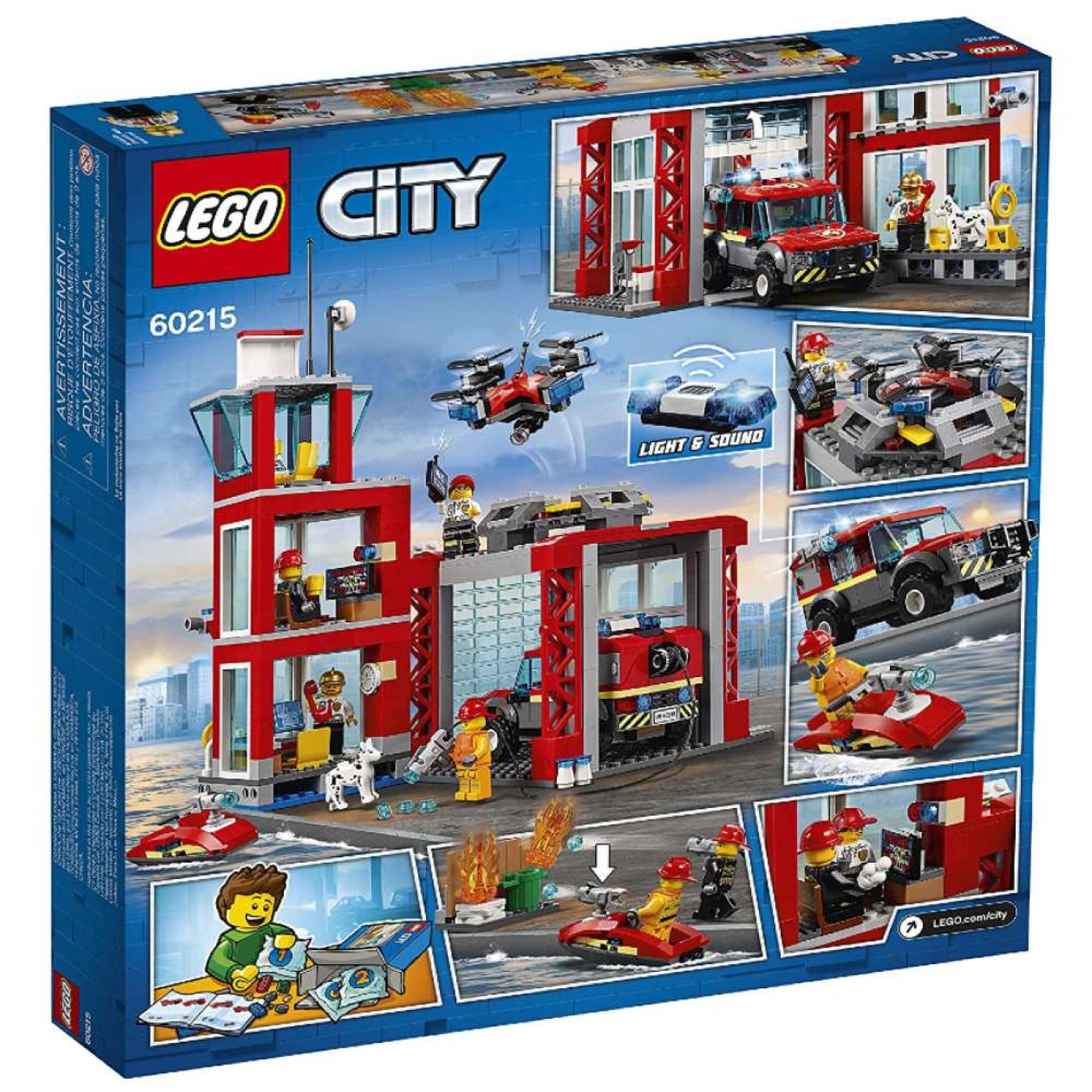 » Construa um quartel dos bombeiros de três andares com torre de vigilância e garagem separada, um veículo de combate a incêndios off-road com mangueira de incêndio e novas peças de luzes e som. Inclui 4 minifiguras lego city: um chefe de bombeiros e 3 bombeiros, além de um cachorro