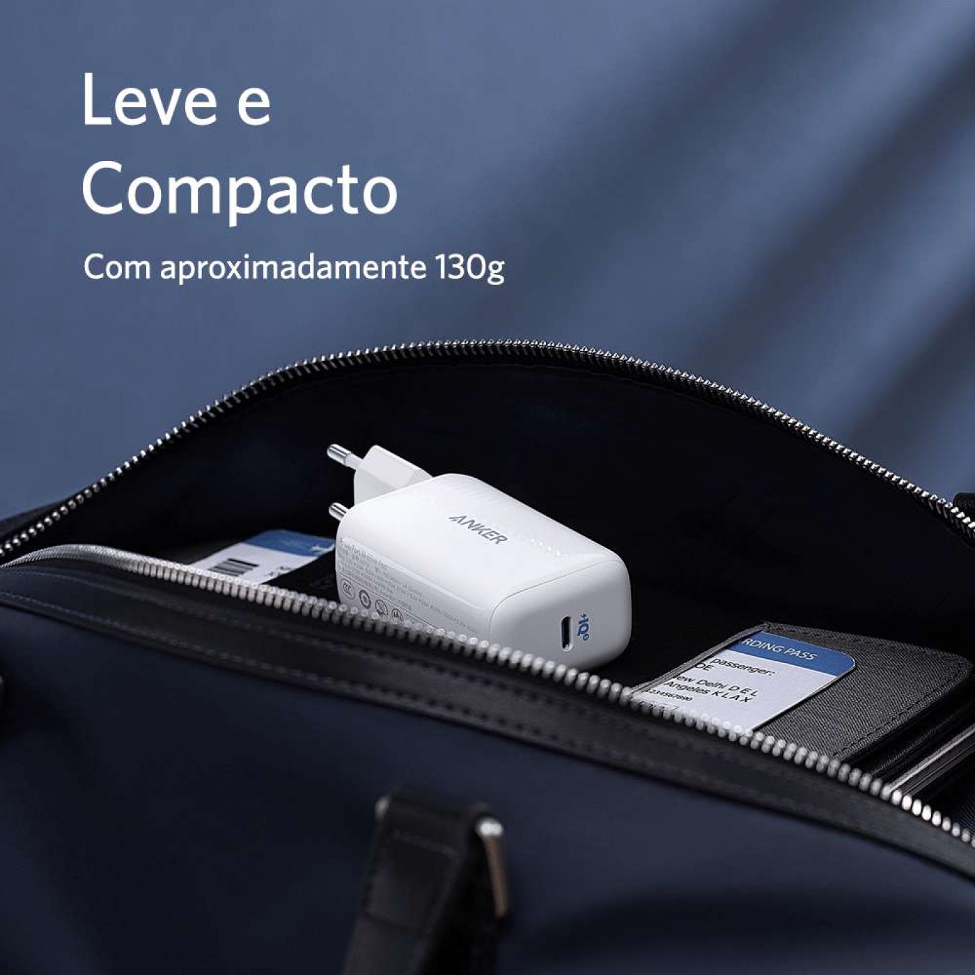 O carregador possui design compacto feito para ser transportado com facilidade em mochilas e bolsos.