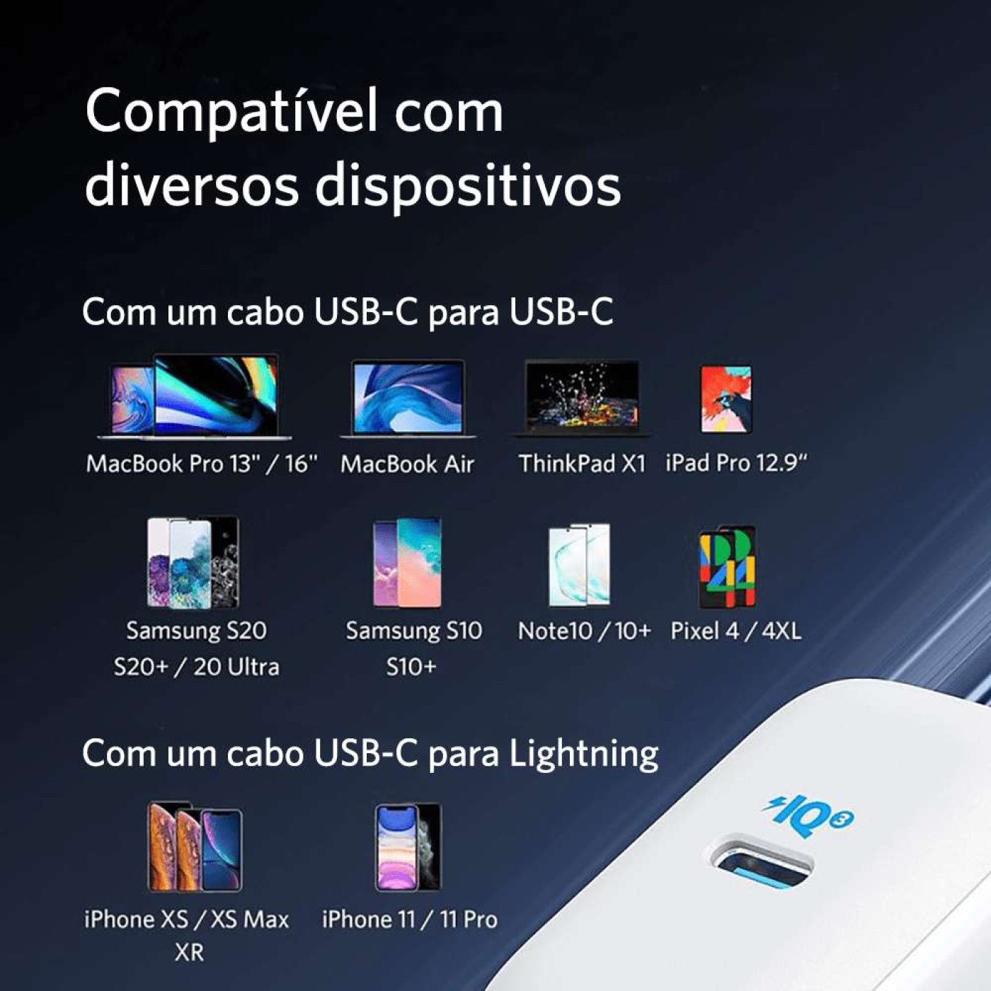 De iPhones para Samsungs para Notebooks USB-C e mais! A tecnologia exclusiva da Anker PowerIQ 3.0 garante o carregamento mais rápido possível de todos os dispositivos.