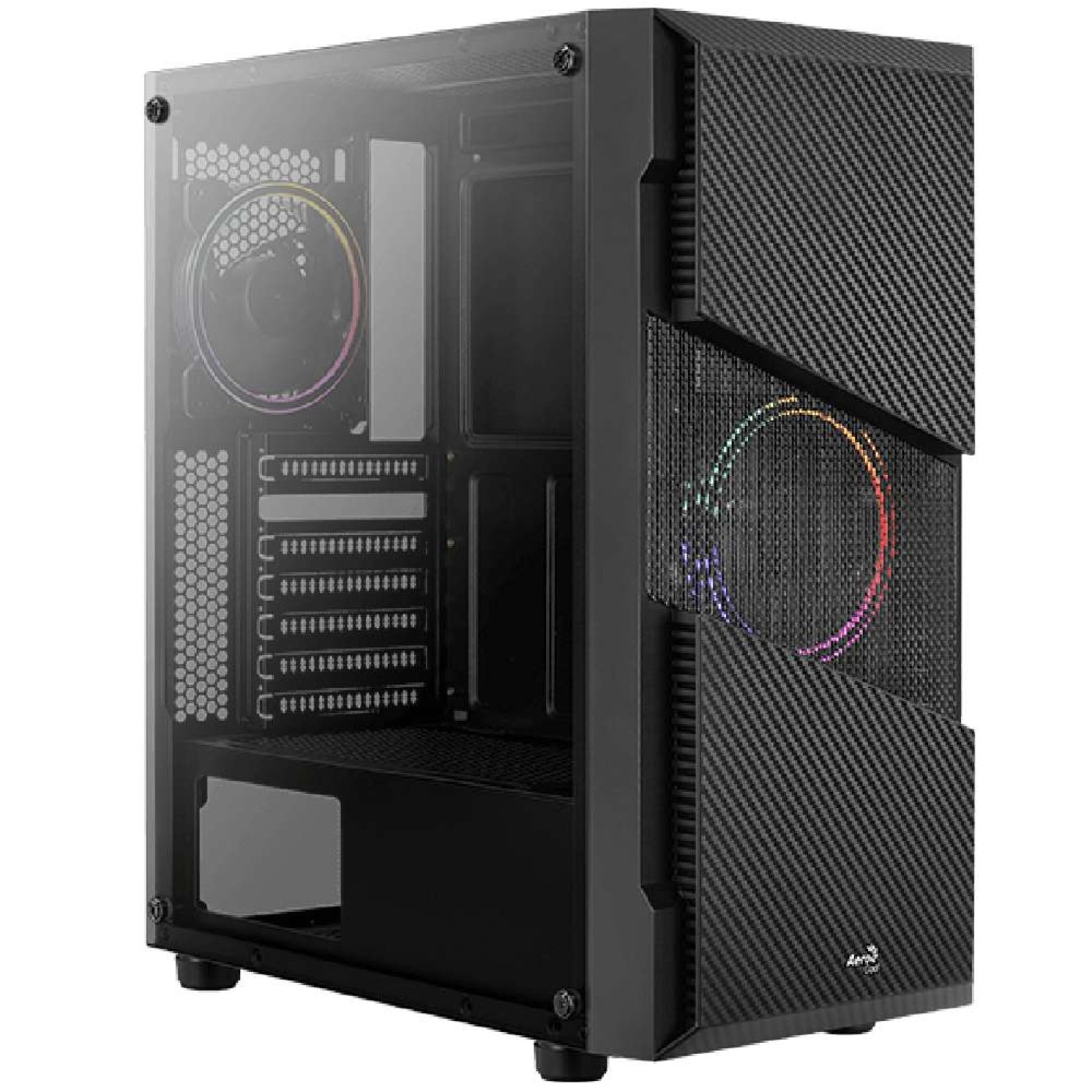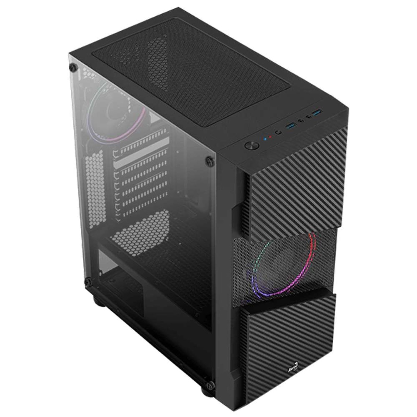 Gabinete de torre central de alto desempenho com um design de painel frontal em malha para maior fluxo de ar e ventilação. O painel frontal estilo fibra de carbono oferece uma aparência futurista à sua configuração de jogos. Vem equipado com um painel lateral de vidro temperado completo para mostrar o interior da sua plataforma. Vem equipado com o ventilador Saturn 12 FRGB com iluminação RGB fixa para criar um efeito de iluminação estático, adicionando um toque elegante ao seu equipamento.