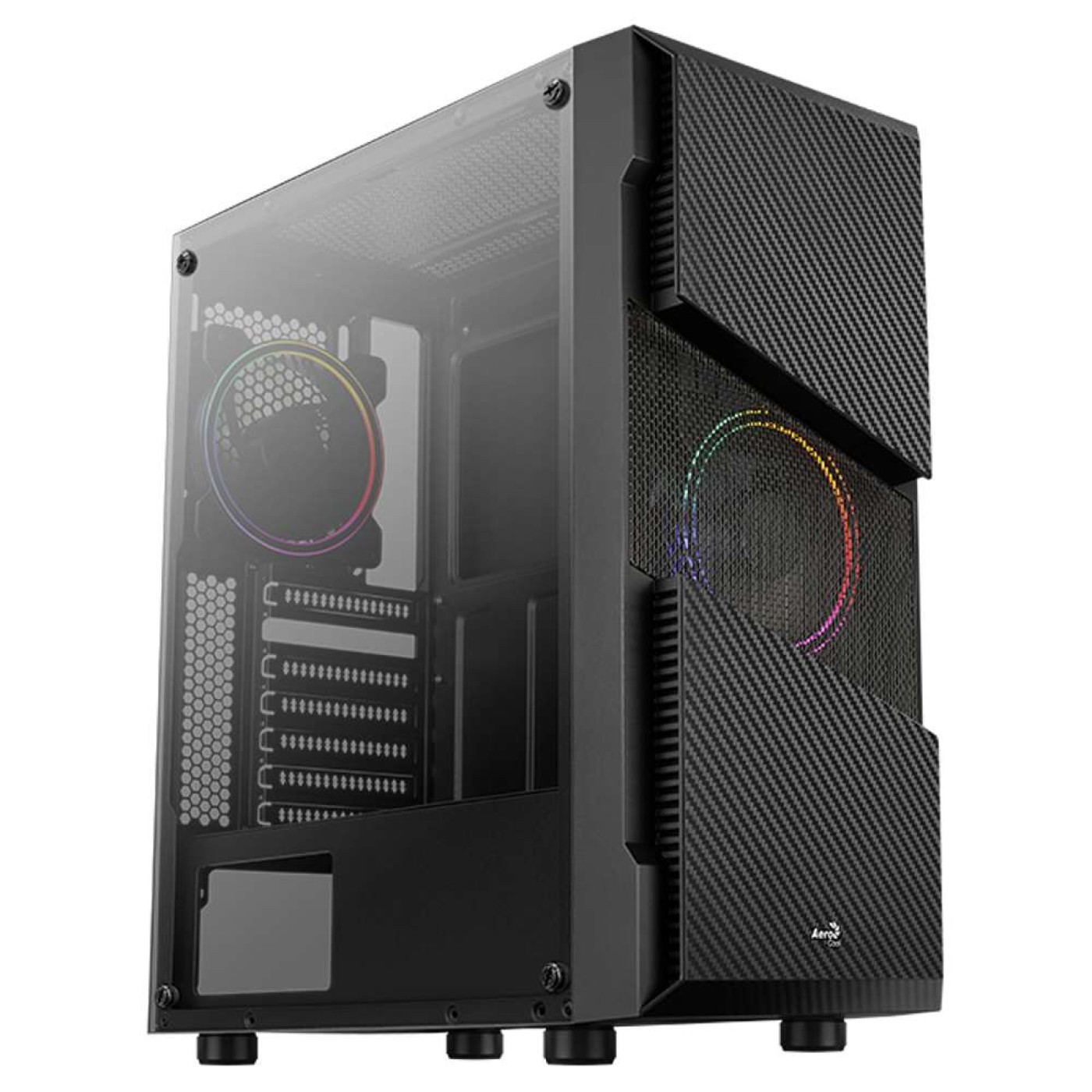 Apresentando um elegante acabamento em fibra de carbono no painel frontal, este gabinete adiciona um toque futurista à sua configuração de jogos.