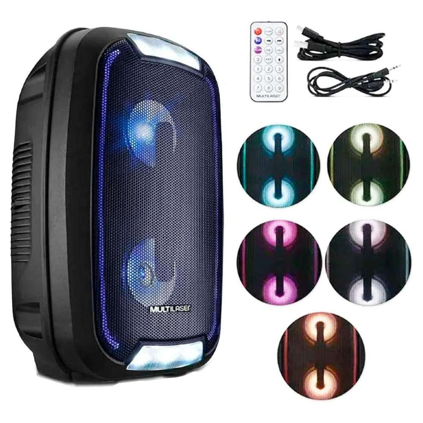 Com Potência de 200W RMS e iluminação de LED, a caixa de som permitirá você ouvir, cantar e dançar, tudo com um som alto e potente distribuídos em 2 alto-falantes de 4 polegadas, ideal para qualquer ambiente.