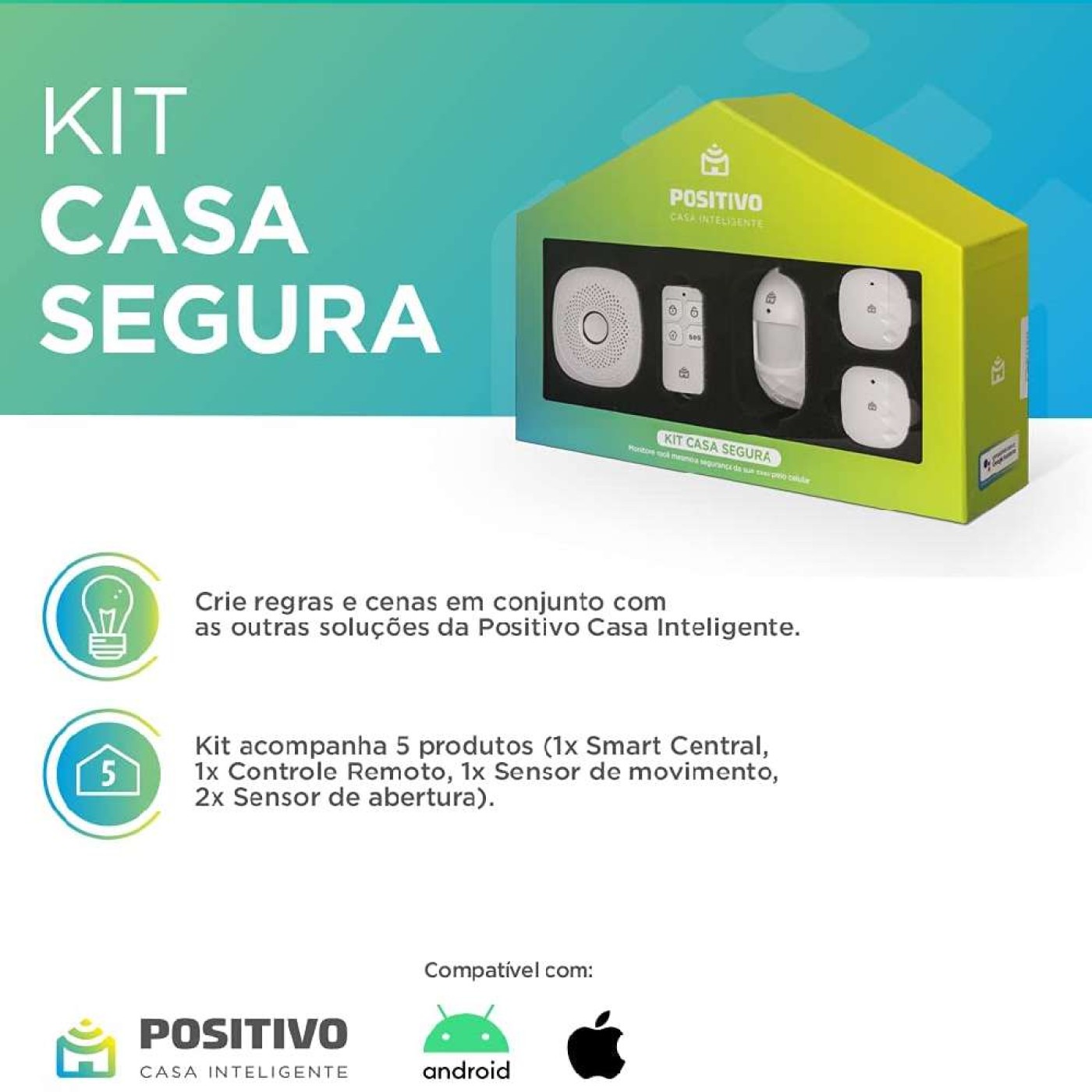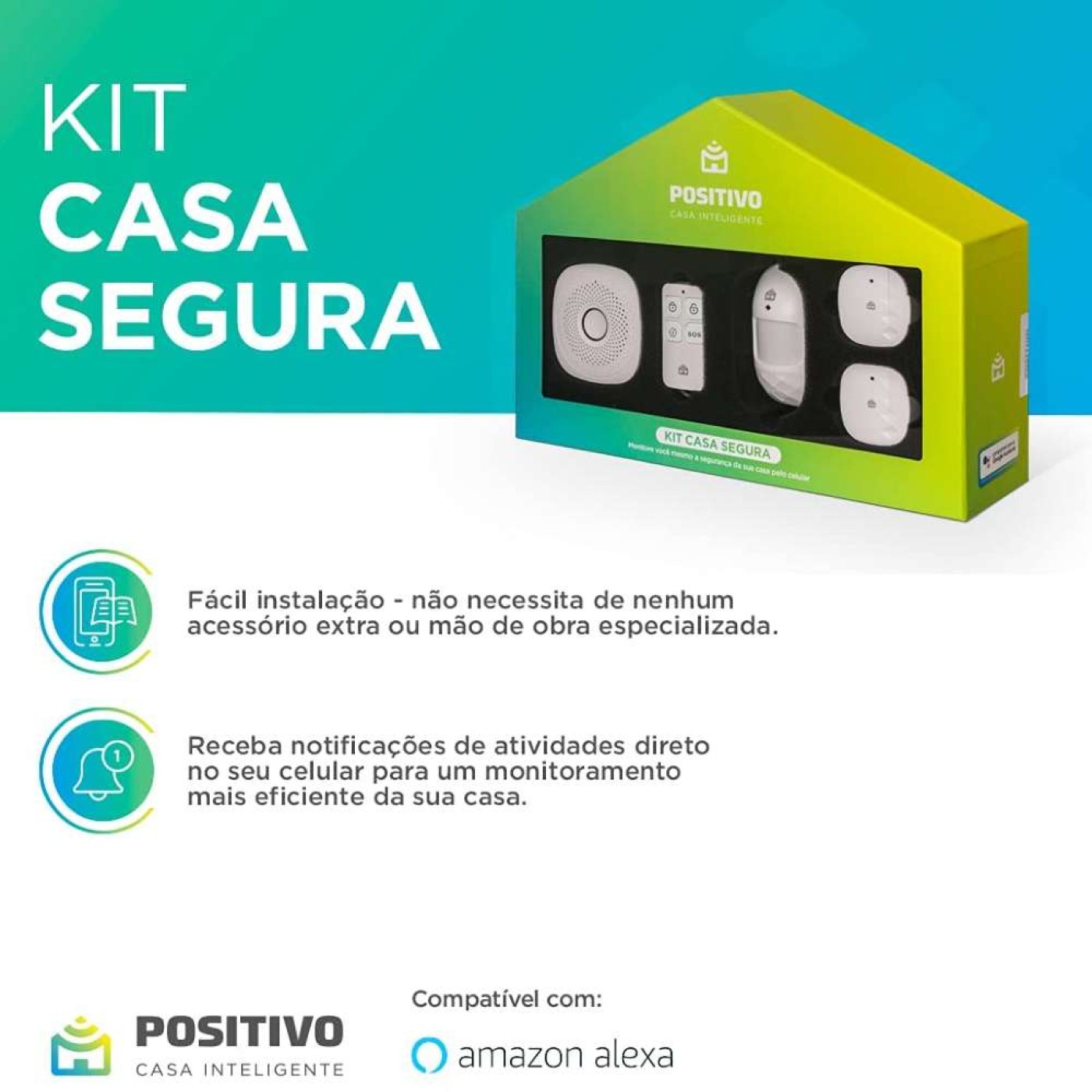» Com o Kit Casa Segura, você monitora a segurança da sua casa de onde estiver. Arme ou desarme o alarme, verifique o status dos sensores e receba notificações de atividade. Você ainda pode utilizar os sensores combinados com os demais produtos de conforto e automação da Positivo Casa Inteligente.