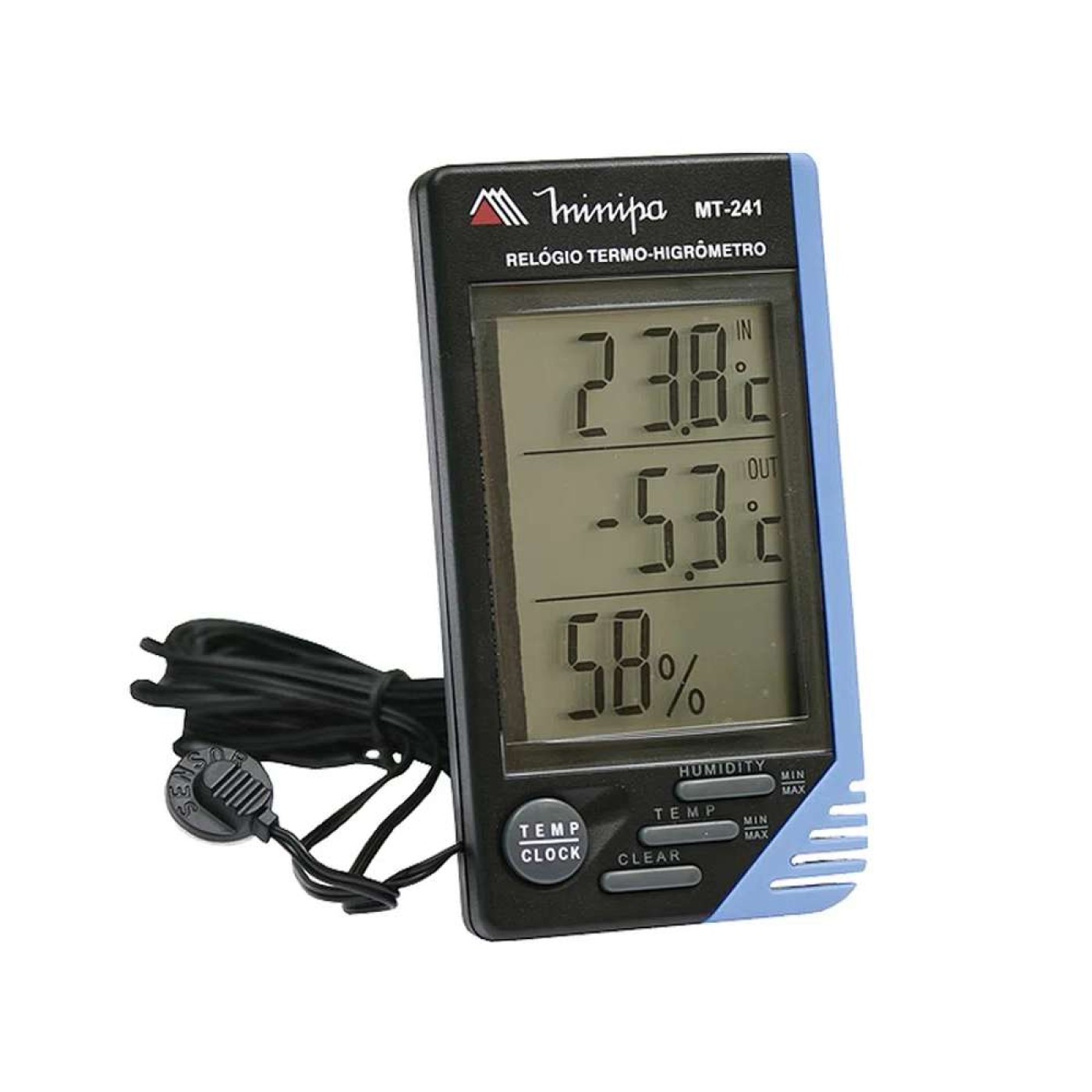 » O Termo-Higrômetro Digital Minipa MT-241 é um instrumento digital portátil, com medida de temperatura interna e externa, 3 leituras simultâneas, indicação de horas, registro de máximo e mínimo e precisão básica de 1°C e 10% RH. Realiza medidas de temperatura interna (ambiente em que se encontra o instrumento) de 0°C a 50°C (32°F a 122°F), temperatura externa (sensor com cabo de extensão) de -50°C a 70°C (-58°F a 158°F) e umidade relativa interna de 20% a 90%.